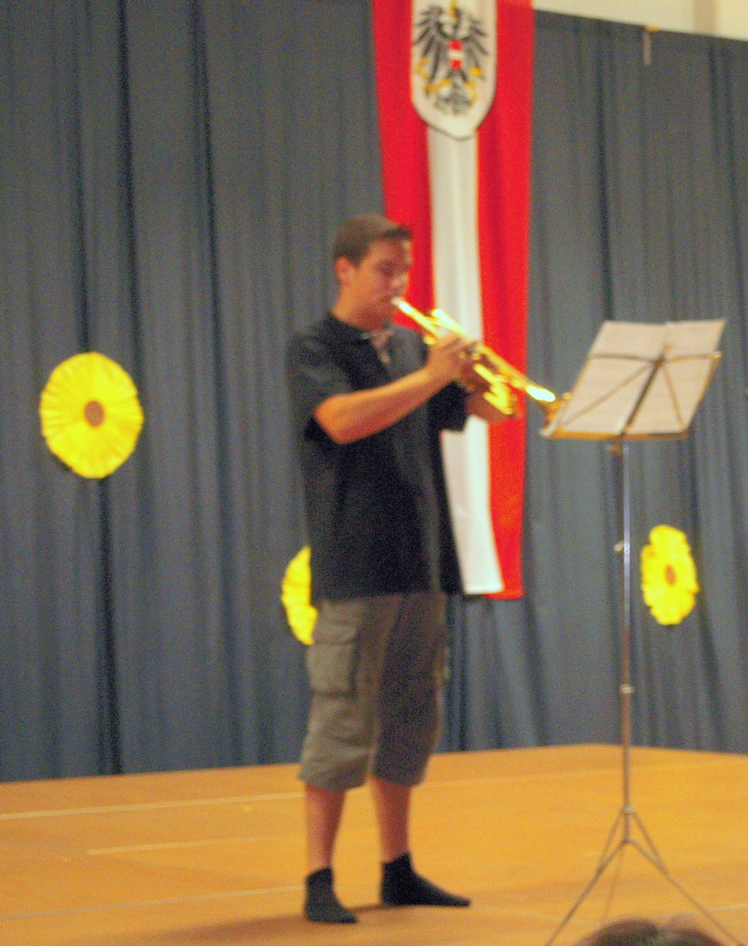 Senger Bernhard (4.c) eröffnet die Feier mit einem Trompetenstück. Dir. Irmgard Schwentner begrüßt die Gäste, Bgm. Ing. Franz Höfer wünscht den abgehenden SchülerInnen Erfolg für ihre Zukunft, die Klassensprecherinnen leiten zum Programm des Abends über.